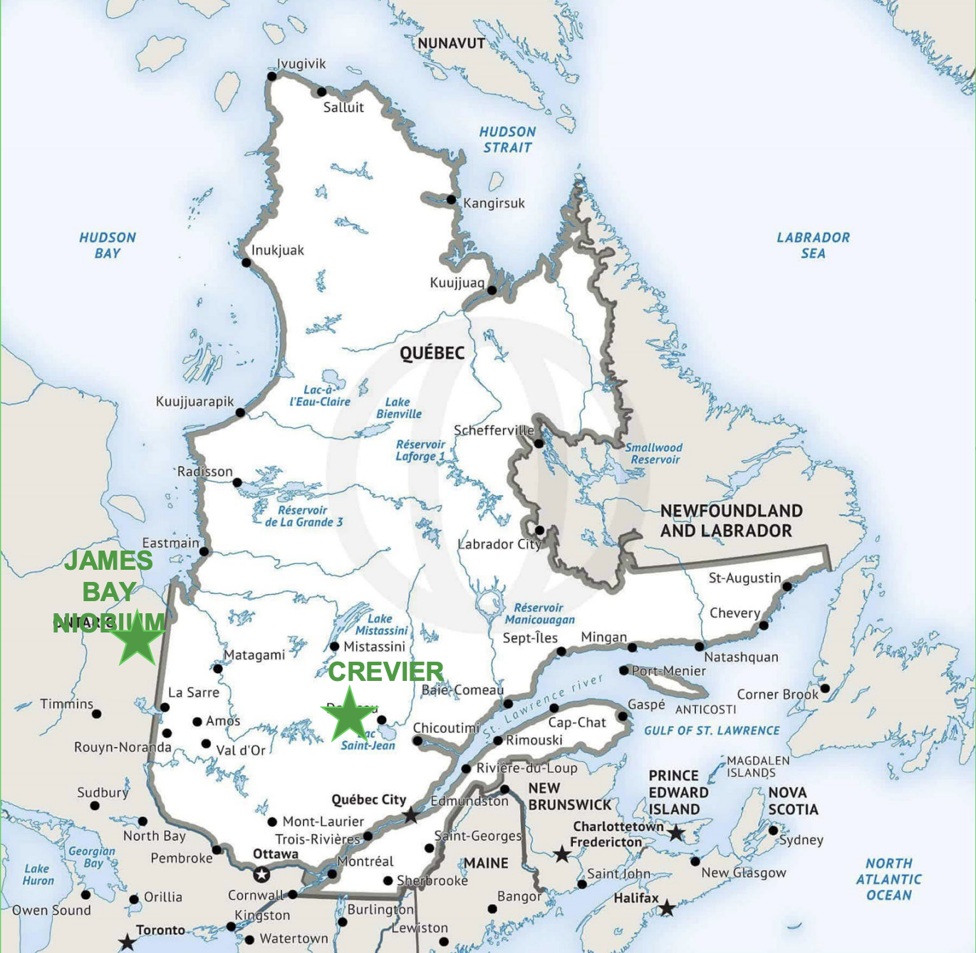 Actuellement, NioBay travaille sur deux projets au Canada : Crevier, dans la province de Québec, et Baie James, en Ontario. Le principal minéral trouvé est le niobium, mais d’autres minéraux intéressants sont encore découverts. Deux projets sont également en phase d’exploration : Gouin au Québec et Valentine, en Ontario. Ont également été ajoutés en 2023 un ensemble de terres à explorer pour le lithium (un autre minéral essentiel pour le Canada). Cet ensemble foncier représente plus de 250 titres miniers pour 14 116 ha est situé au nord du projet Crevier.
